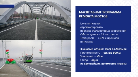 По итогам текущей пятилетки планируется выполнить ремонт и реконструкцию порядка 24 тыс. пог. м (около 500 мостовых сооружений), что в 1,3 раза больше, чем за предыдущие пять лет.