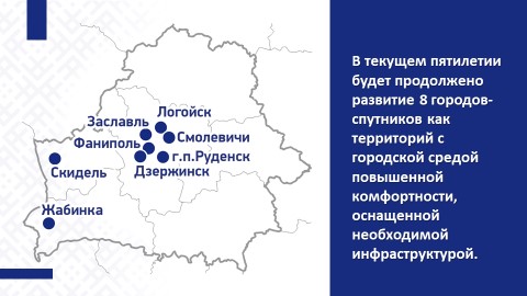 В 2026–2030 гг. будет продолжено развитие 8 городов-спутников в Брестской (г.Жабинка), Гродненской (г.Скидель), Минской (города Дзержинск, Заславль, Логойск, Смолевичи, Фаниполь, г.п.Руденск) областях как территорий с городской средой повышенной комфортности, оснащенных необходимой инфраструктурой.